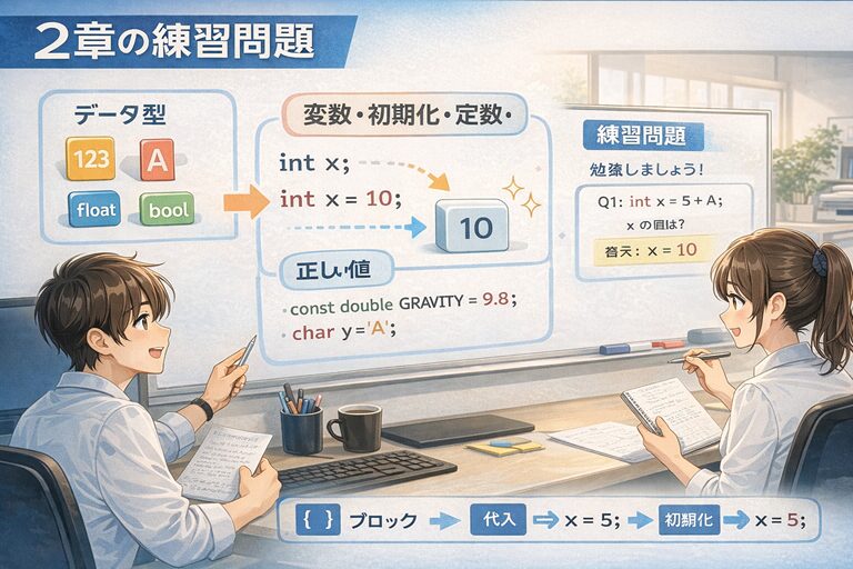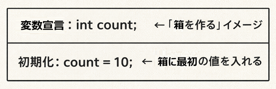 そして値を変数に格納していく「代入」、初期値を設定する「初期化」などを学びました。