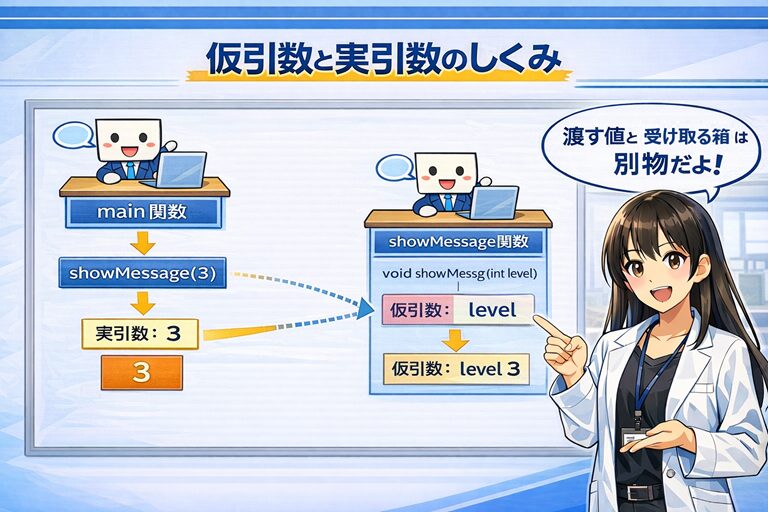 | 実引数 | 呼び出し側が渡す具体的な値 |