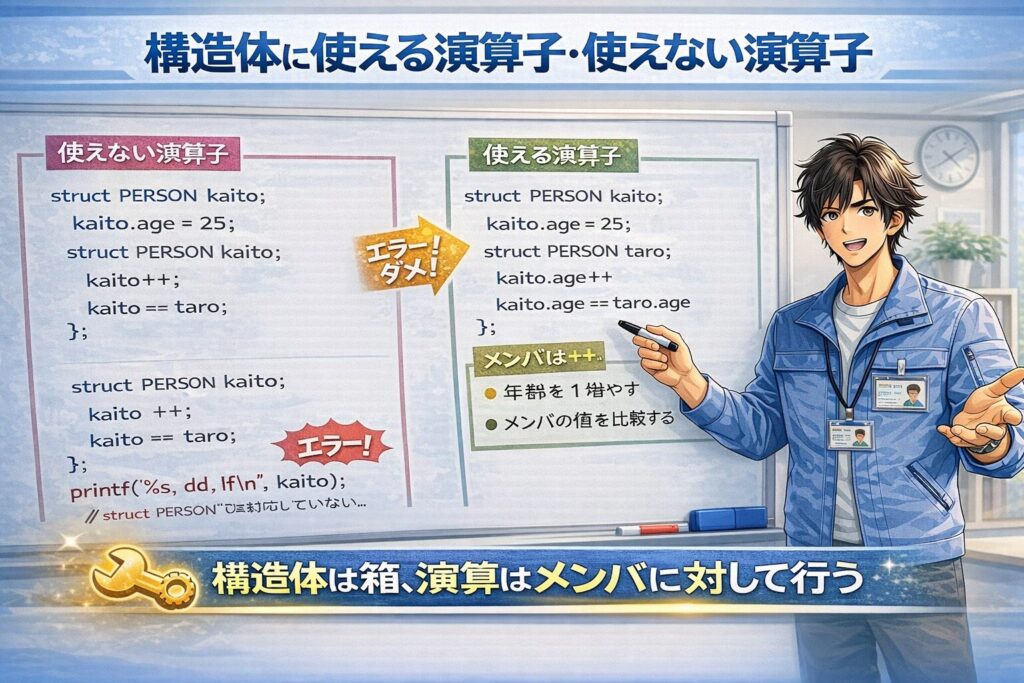 C言語入門|構造体に使える演算子・使えない演算子
