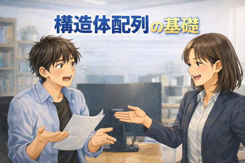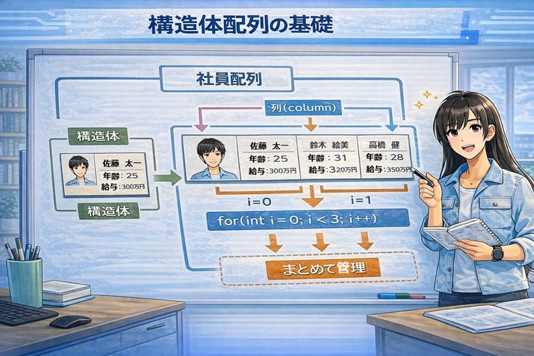 社員情報を構造体配列で管理する例 に置き換えて解説します。