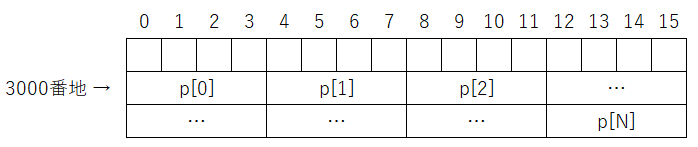| *(p+N) | 3000 + 4×N 番地を先頭とする int |
