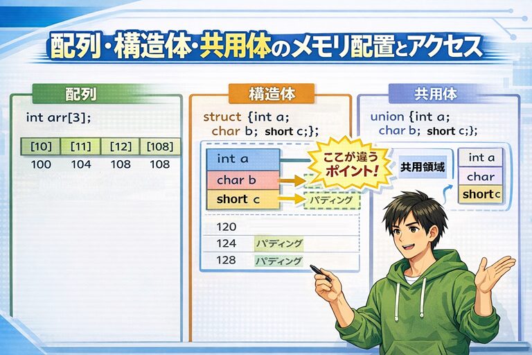 C言語入門|配列・構造体・共用体のメモリ配置とアクセス