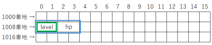 | 構造体 | メンバごとに別領域(隙間あり) |