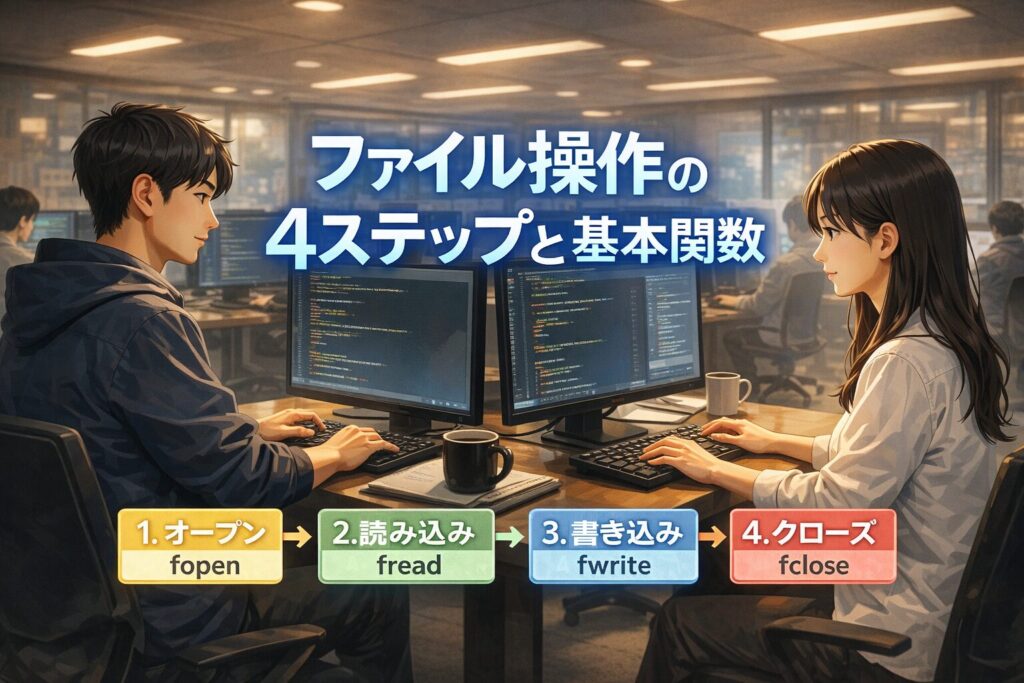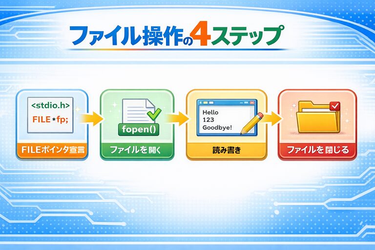 C言語では、ファイルの読み書きを 次の4つのステップ で行います。