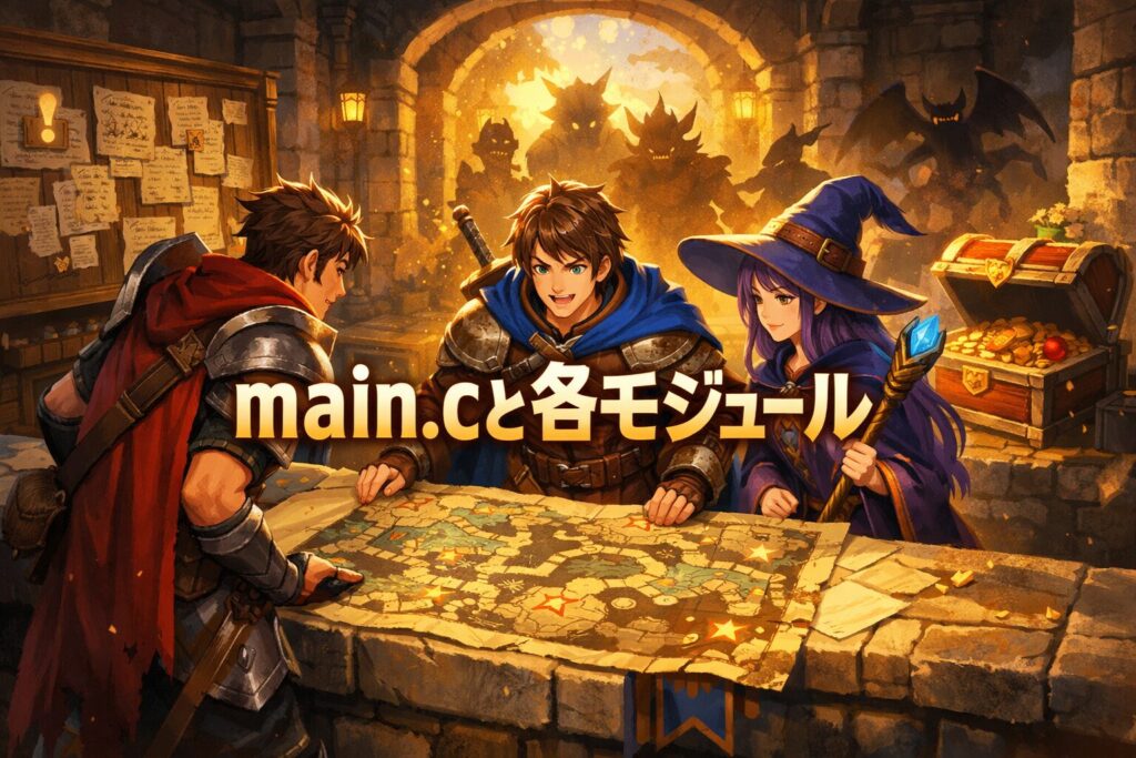 逆に言うと、main.cに「宝箱の中身決定」や「敵AIの判断」みたいな細かい処理は置かないのがポイントです。