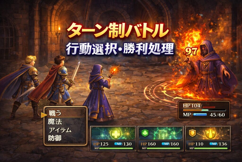 ここでは「敵1体 vs 味方パーティ」の形式で作ります(まずはシンプルが正義)。