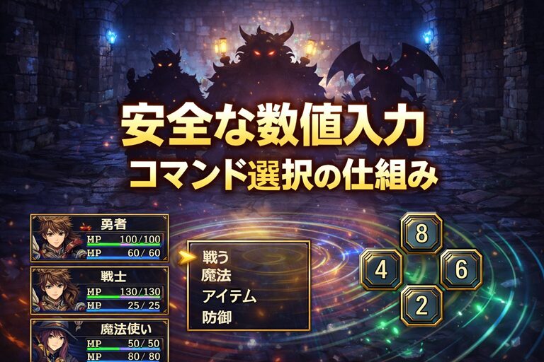 RPGの各画面(タイトル・探索・戦闘・宿・教会など)では「数字で選ぶ」「コマンドを選ぶ」操作が大量に出てきますが、毎回 scanf や getchar を直書きし始めると、すぐにバグの温床になります。