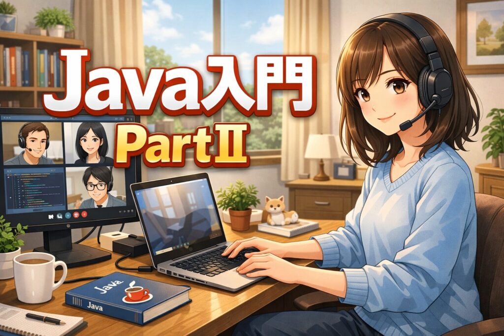 「Java入門 PartⅡ」は、基礎を学んだあとに、より実践的なプログラムへと進むためのステップアップパートです。条件分岐や繰り返し処理といった、プログラムの流れをコントロールする重要な仕組みを中心に学びます。これにより、状況に応じて動きを変えるプログラムや、効率的に処理を行うコードが書けるようになります。また、配列によるデータ管理や、クラスとオブジェクトの基本も学び、より現実的な問題に対応できる力を身につけていきます。基礎から応用へとつなげる大切な一歩となる内容です。