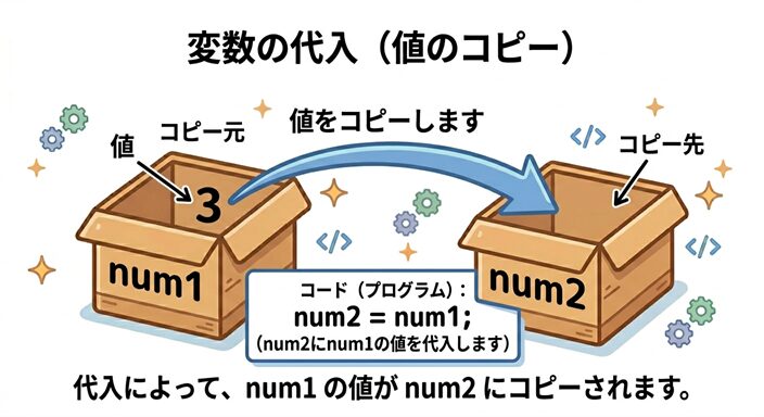 代入というと、3 や 5 のような決まった数値を入れるイメージが強いかもしれません。けれども、代入の右側に書けるのは数値だけではありません。変数の値を、ほかの変数に代入することもできます。