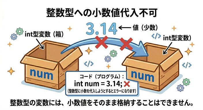 この図では、小数値である 3.14 を int型の変数へ入れようとしても、そのままでは受け入れられないことを表しています。