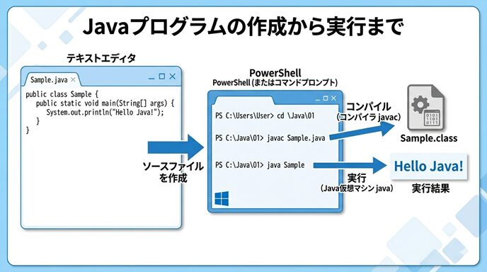 この図は、Javaプログラムがどのような順番で動くのかを視覚的に表しています。まず、テキストエディタで Sample.java を作成します。次に、PowerShell でその保存先へ移動し、javac Sample.java を実行して Sample.class を作成します。そして最後に java Sample を実行すると、画面に 「Hello Java!」 が表示されます。