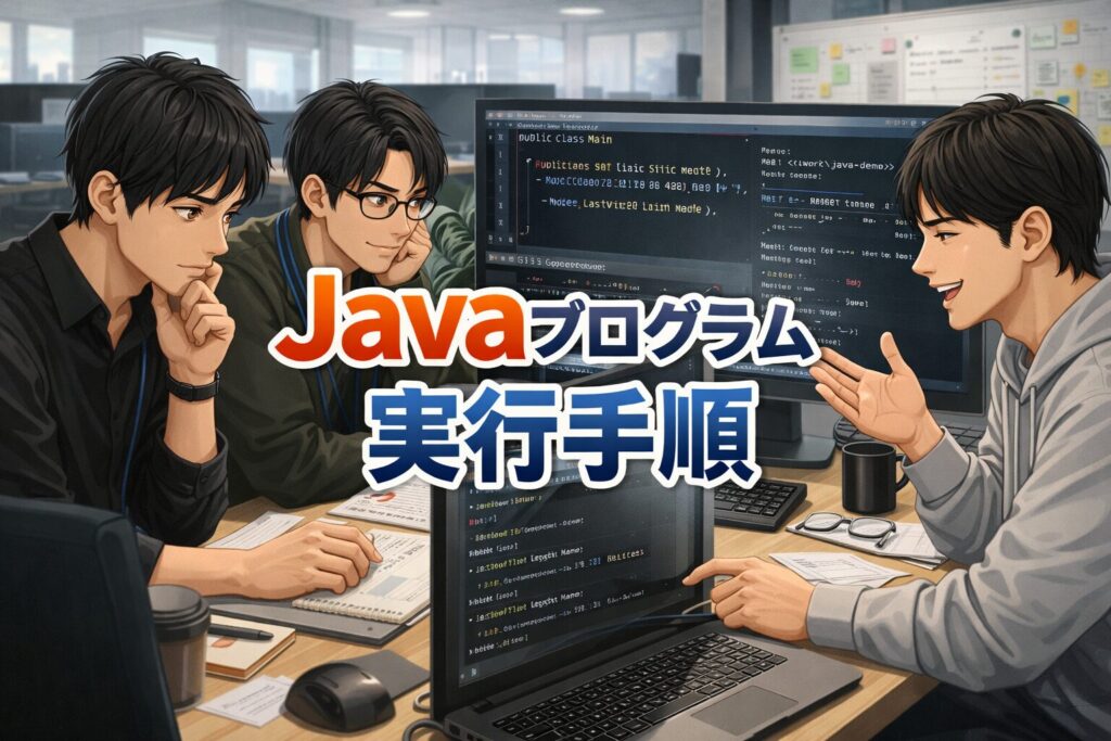 この記事では、クラスファイルができたあとに、どのようにプログラムを実行するのかを、基本から丁寧に説明していきます。java コマンドの使い方、クラス名の指定方法、画面に結果が表示される意味、インタプリタや Java仮想マシンの考え方、そしてこれまで学んだ 作成 → コンパイル → 実行 までの流れもあわせて整理していきます。Java学習の基本がしっかりつながるように、順番に見ていきましょう。