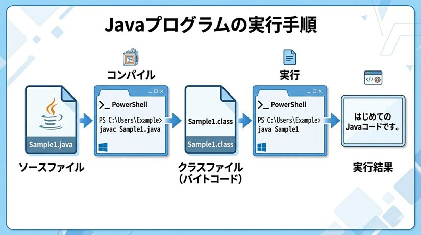 この図は、まず Sample1.java というソースファイルをコンパイルして Sample1.class を作成し、そのあと java Sample1 を実行することで、画面に「 はじめてのJavaコードです。」 が表示される流れを表しています。