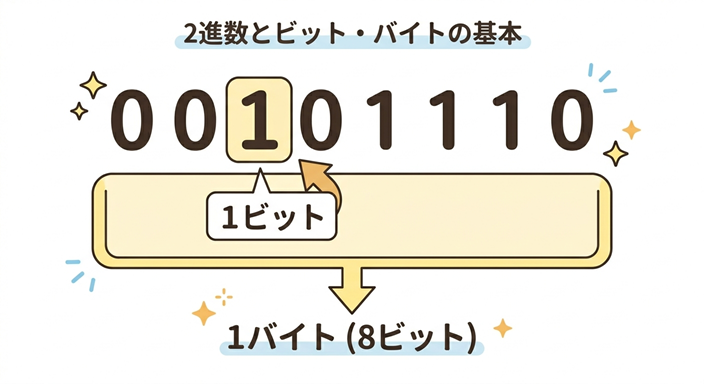 この図では、2進数の1桁が1ビットであり、8桁そろうと1バイトになることを表しています。ビットは最小単位、バイトはそれを8個まとめた単位、という関係がひと目でつかめます。
