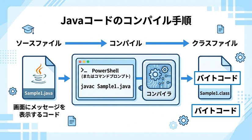 この図では、Sample1.java というソースファイルを、javac Sample1.java というコマンドでコンパイルし、その結果として Sample1.class というクラスファイルが作成される流れを表しています。Javaでは、テキストエディタで入力したコードをそのまま実行するのではなく、まずコンパイラを使ってバイトコードへ変換する必要があります。