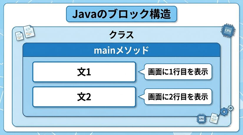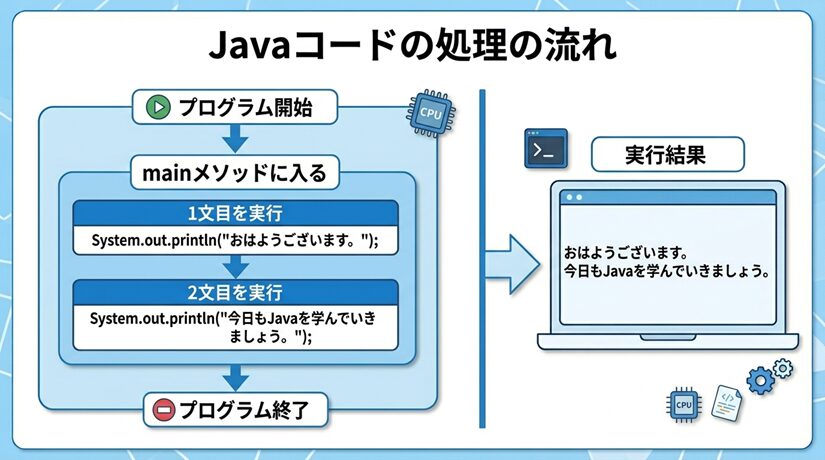この図のポイントは、処理が上から下へ順番に進むことが視覚的にわかるところです。Javaの基本では、mainメソッドの中の文は、原則として並んでいる順に実行されます。
