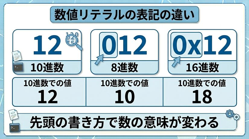 最初は 012 や 0x12 のような表記に少し戸惑うかもしれませんが、基本のルールはとても素直です。