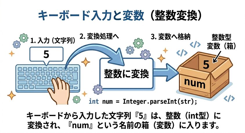 大事なのは、いきなり整数が入るのではなく、いったん文字列として受け取り、そのあとで整数へ変換しているという順番です。