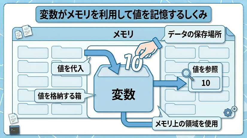 コンピュータの内部には、さまざまな値を一時的に記憶しておくためのメモリがあります。プログラムが動いているあいだ、このメモリの領域を使って数値や文字などの情報を保持しています。変数は、このメモリを利用して値を記憶するしくみです。
