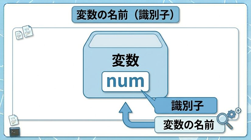 識別子とは、変数やその他の要素につける名前として使える文字の組み合わせのことです。num も識別子のひとつです。
