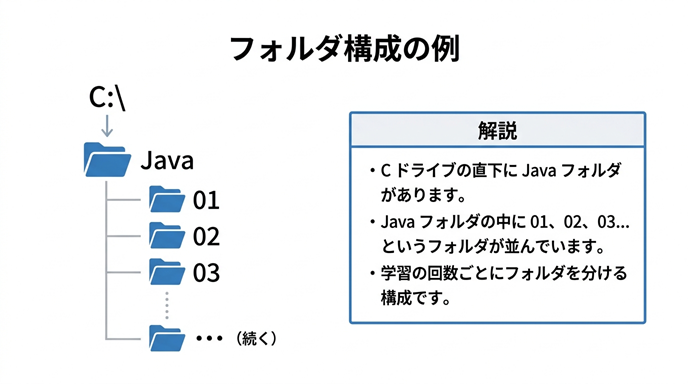 Java学習では、作業場所をわかりやすく整理するために、Cドライブ直下に Java というディレクトリを作る方法がよく使われます。