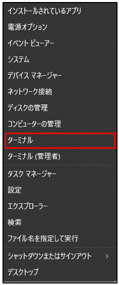 デスクトップ画面の中央下にあるスタートボタンを右クリックし、メニューから ターミナル を選択します。