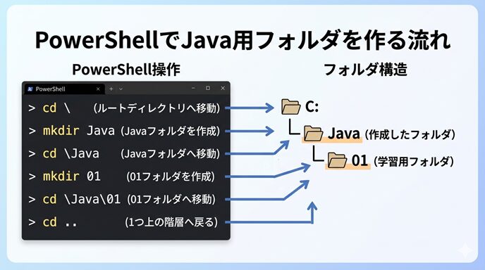 Javaを学ぶ人にとって、PowerShell は補助的な道具ではなく、学習を進めるための作業机のような存在です。机の上が整っていれば勉強しやすいのと同じで、PowerShell での操作に慣れていると、Javaの理解にも集中しやすくなります。
