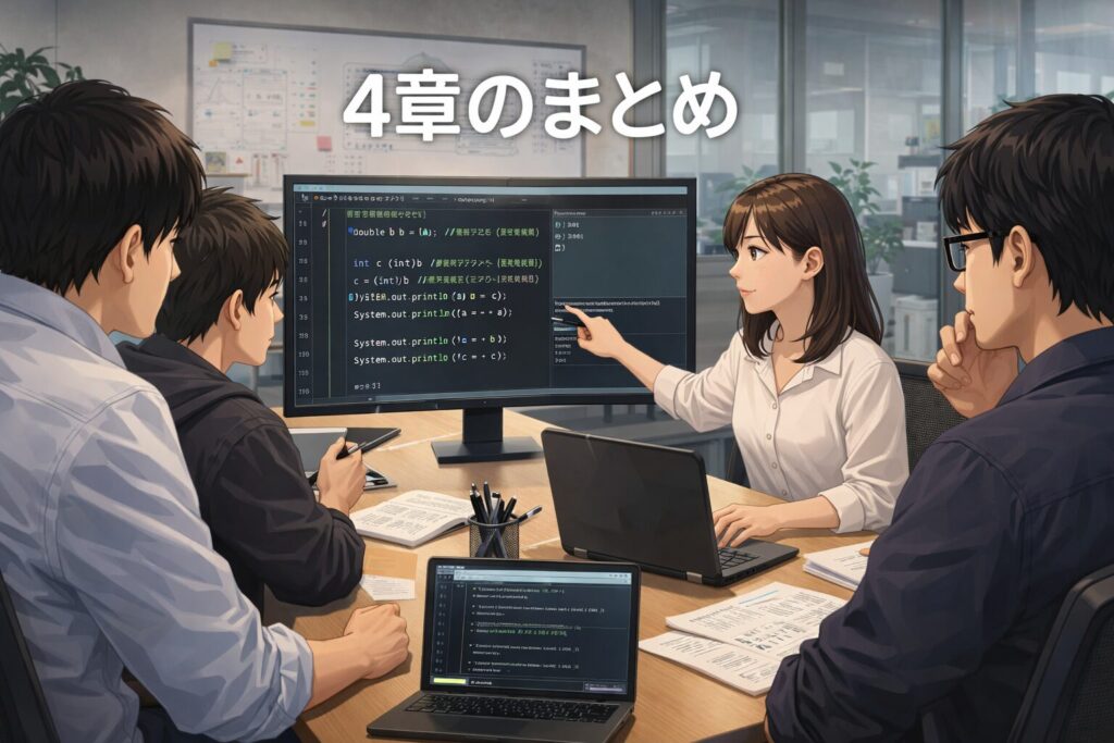 つまり、4章は単に「計算の書き方を覚える章」ではなく、Javaの処理を読み解くための基礎を固める章だったといえます。