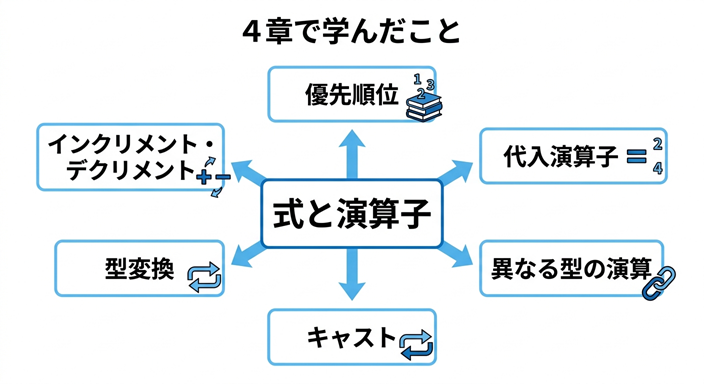 この図では、4章の中心にあるのが「式と演算子」であり、その周りにインクリメント・デクリメント、代入演算子、優先順位、型変換、キャスト、異なる型の演算といった内容がつながっていることを示しています。