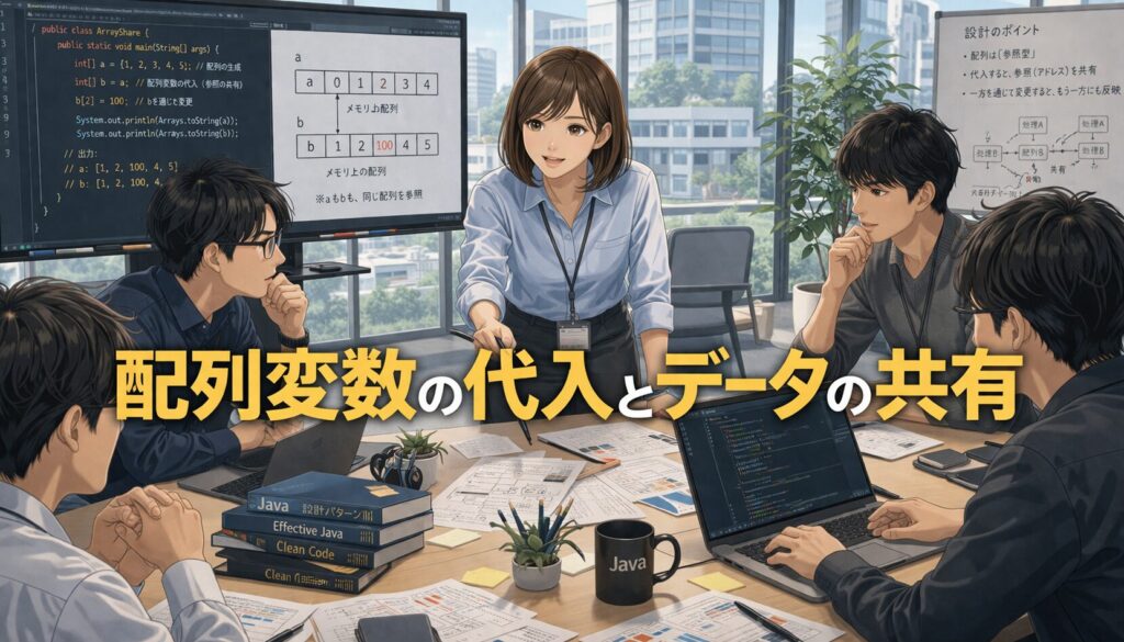 配列の学習では、要素の扱い方だけでなく、配列変数の動きもとても大事です。このしくみがわかると、Javaの配列をより正確に、そして安心して使えるようになります。