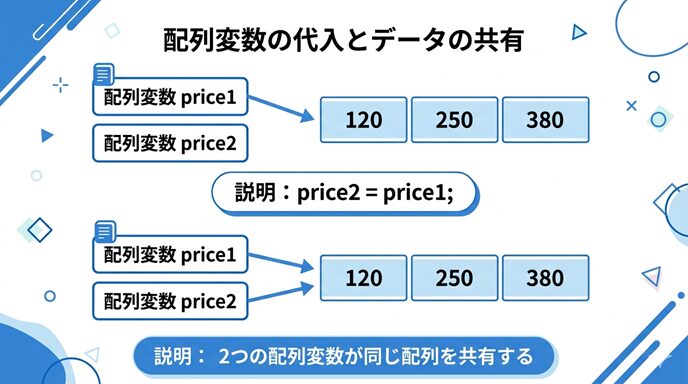 ここでは、配列変数に別の配列変数を代入したときの動き、1つの変数から値を変更するともう片方にも影響する理由、そして配列変数が参照型であることの意味まで、やさしく整理しながら見ていきましょう。