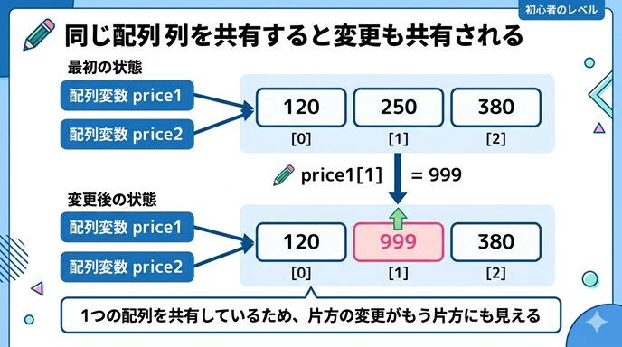 この図では、price1 と price2 の両方が同じ配列へつながっているため、price1 側から2番目の値を 999 に変えると、price2 側から見てもその値が 999 になっていることを表しています。