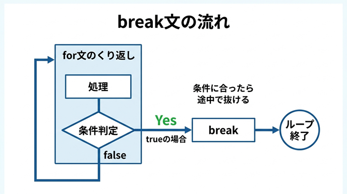 この図でいちばん伝えたいのは、break文が通常のくり返しの流れを途中で切り替えるという点です。