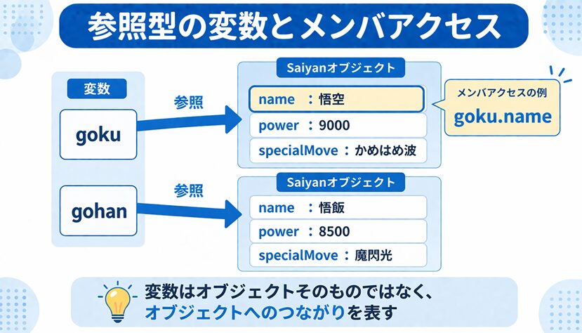 ドラゴンボールでたとえるなら、変数は悟空そのものではなく、「この先に悟空がいる」とわかる目印のようなものです。そして、その目印をたどることで、悟空の名前や戦闘力、技といった情報に触れられるようになります。ここでは、この感覚をしっかりつかみながら、参照型の変数とメンバアクセスをやさしく整理していきます。