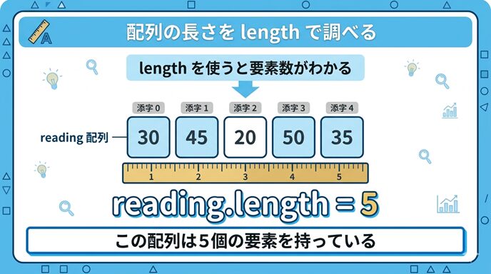 配列を使うと、同じ種類のデータをまとめて扱えるようになりますね。さらに便利に使うために、ぜひ覚えておきたいのが length です。