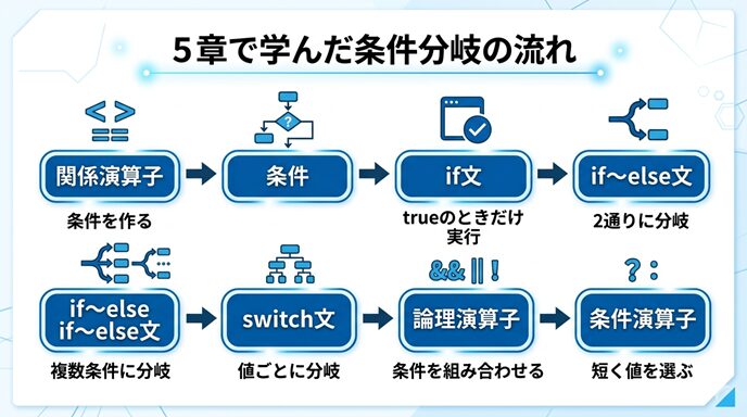 まず条件を作る方法を学び、その条件を使って if文 や switch文 で処理を分け、さらに論理演算子で条件を発展させ、条件演算子で簡潔な書き方も学んだ、という流れになっています。