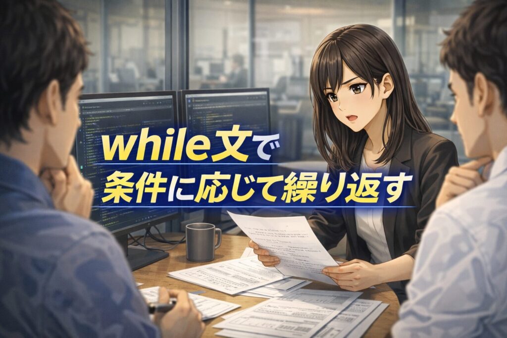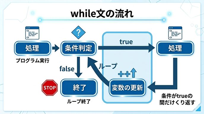 ここでは、while文の基本の形、動き方、for文との違い、注意点までを、サンプルプログラムと表を交えながら丁寧に見ていきます。while文の考え方がつかめると、プログラムの流れをより柔軟に組み立てられるようになります。