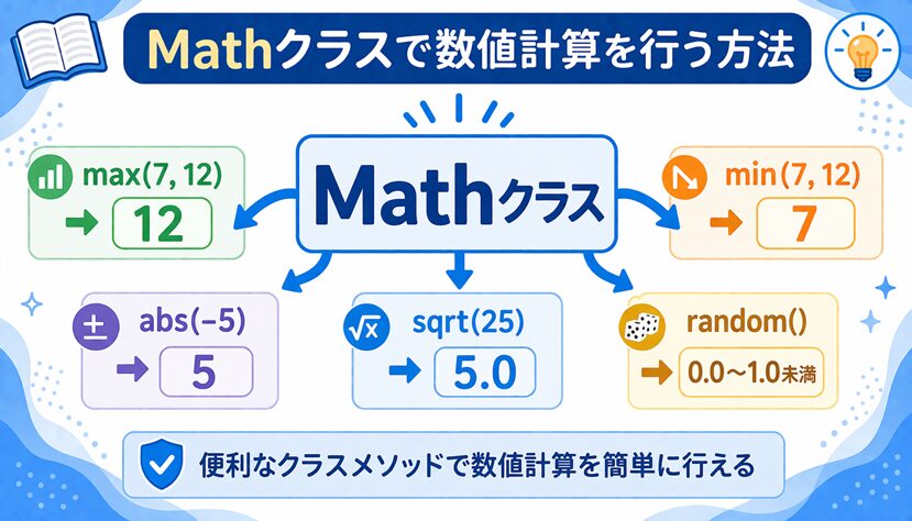 ここでは、Mathクラスの基本的な考え方から、よく使うメソッドの意味、実際のプログラムでの使い方まで、やさしく整理しながら見ていきます。Mathクラスを使えるようになると、数値を扱うプログラムがぐっと書きやすくなります。
