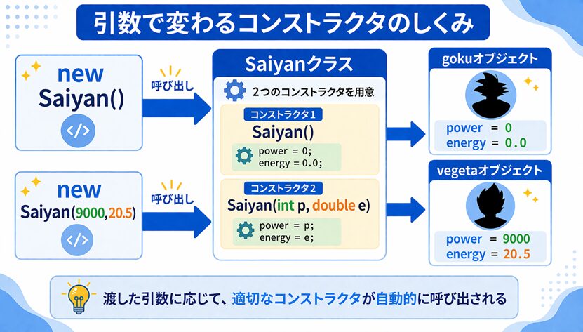 そのため Java は、new Saiyan() と書かれたら引数なしのコンストラクタを使い、new Saiyan(9000, 20.5) と書かれたら引数2個のコンストラクタを使います。