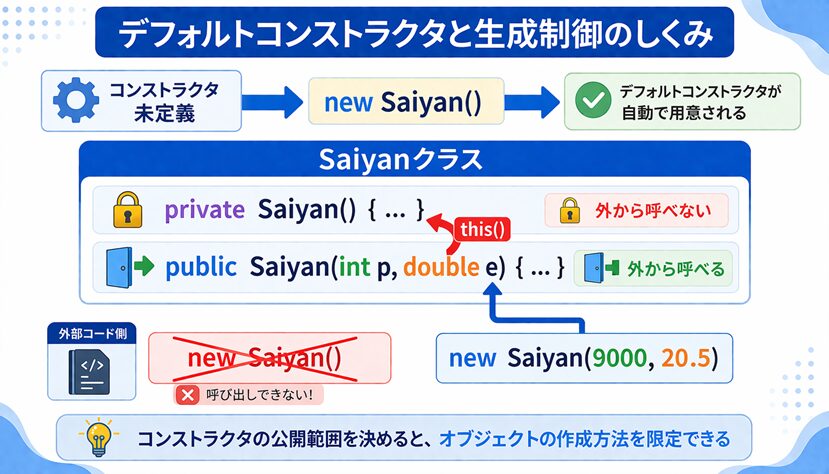 ここで、new Saiyan() は外からは使えず、new Saiyan(9000, 20.5) だけが正式な入口になっていることがわかります。