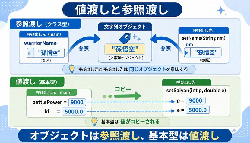 このため、メソッド内で p や e を変えても、呼び出し元の battlePower や ki そのものは変わりません。