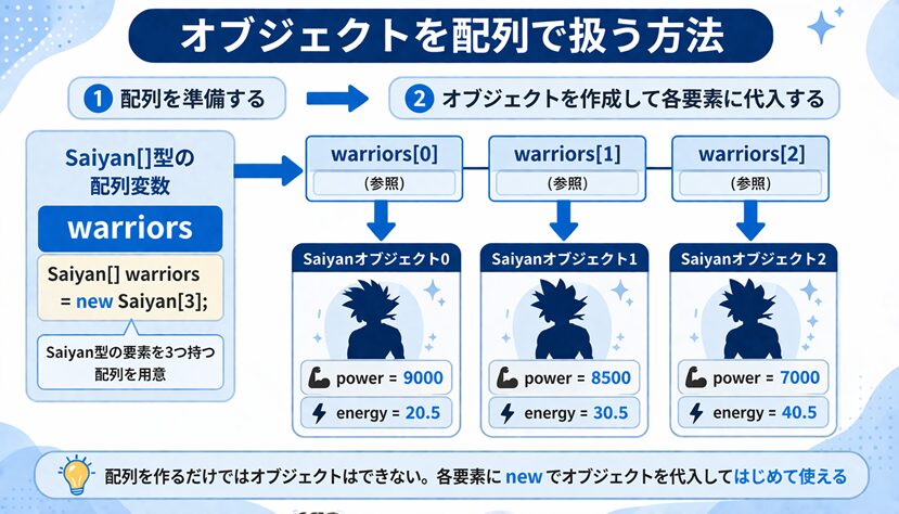 warriors = new Saiyan[3];ここでは、Saiyan 型の要素を3つ持つ配列を用意しています。