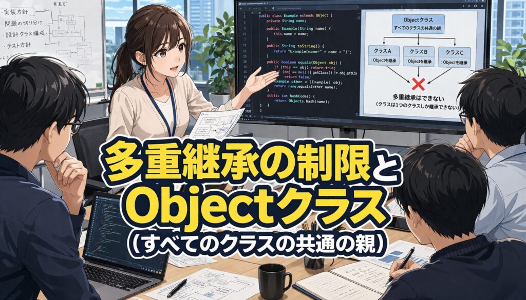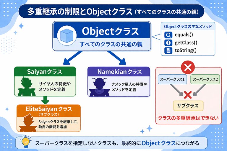 この見方ができると、多重継承の制限も、Objectクラスの意味も、ばらばらの知識ではなく、継承全体のルールとしてすっきり理解できるようになります。