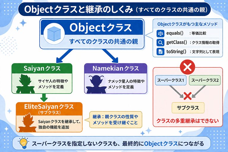 今回は、この Object クラスと継承のしくみを、ドラゴンボールの戦士たちの系譜に置きかえながら、やわらかく丁寧に整理していきます。特に、