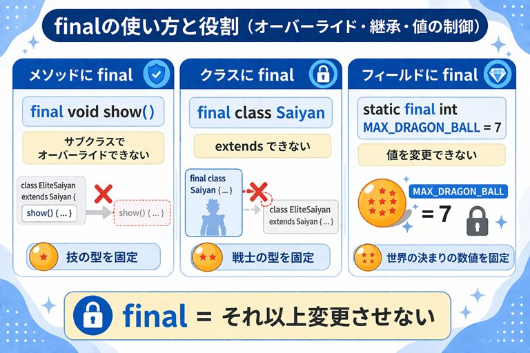 final は、単に厳しく縛るための記号ではありません。ここは変えてはいけない という設計者の意図を、Java のコードにはっきり表すための修飾子です。