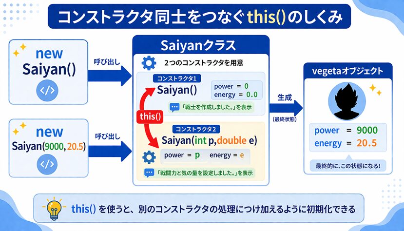 ドラゴンボールで考えると、this() は「まず共通の登場準備をしてから、追加の設定をする」ためのしくみだと思うとわかりやすいです。