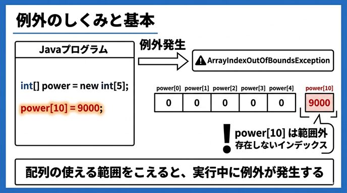 例外の基本をつかむために、配列を使ったシンプルな例を見てみます。