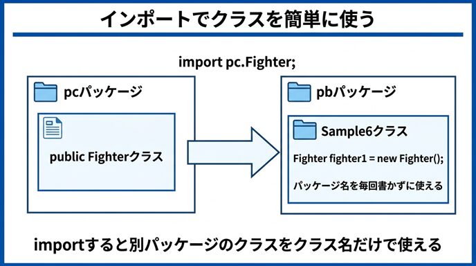 import pc.Fighter; と書くことで、pb パッケージの Sample6 から pc パッケージの Fighter を使いやすくしているだけです。
