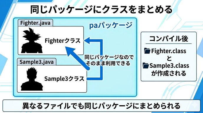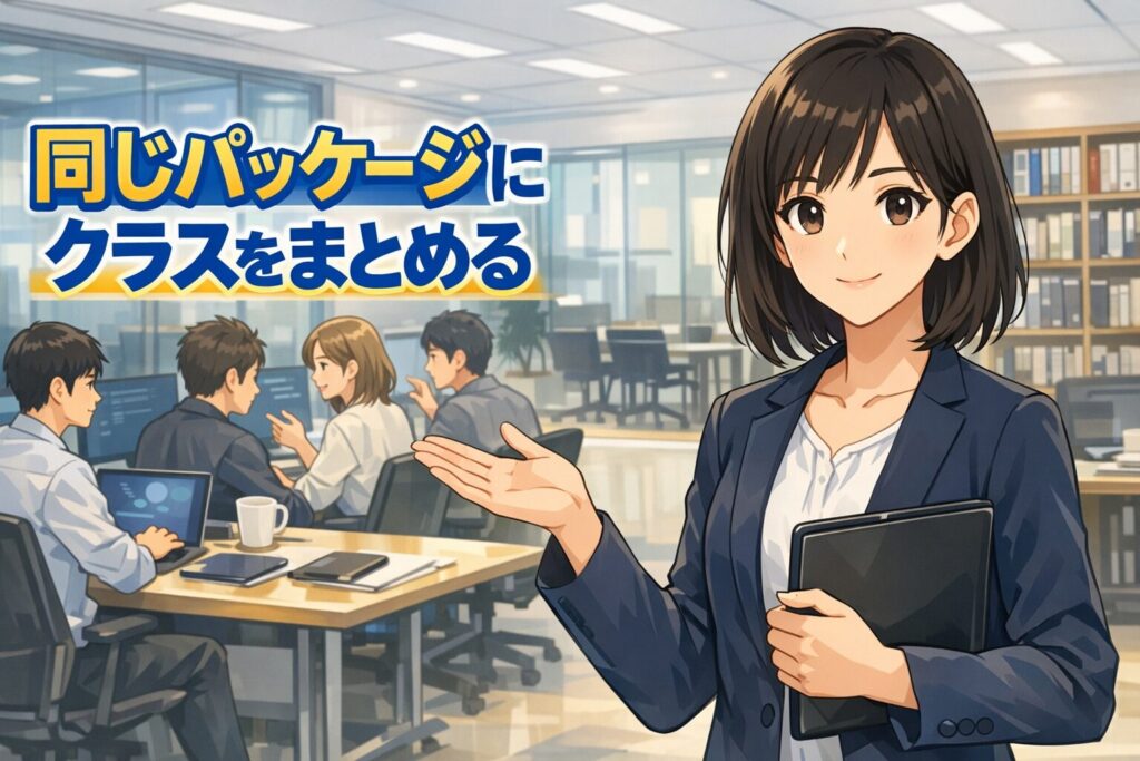 たとえば、ドラゴンボールの世界をイメージして、戦士を表すクラスと、その戦士を使って処理を進めるクラスがあったとします。この2つが別ファイルに分かれていても、同じパッケージに入っていれば、自然に連携しながら使えるようになります。今回はそのしくみを、できるだけやさしく整理しながら見ていきましょう。