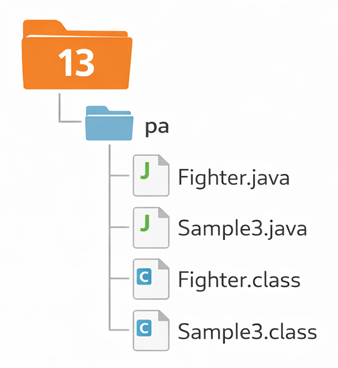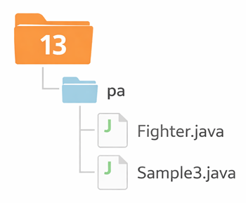 PS C:\Java\13>javac pa\Sample3.javaこのとき、Sample3.java の中で Fighter クラスを使っているので、同じパッケージ内にそのクラスが正しく存在していれば、必要な形でコンパイルが進みます。